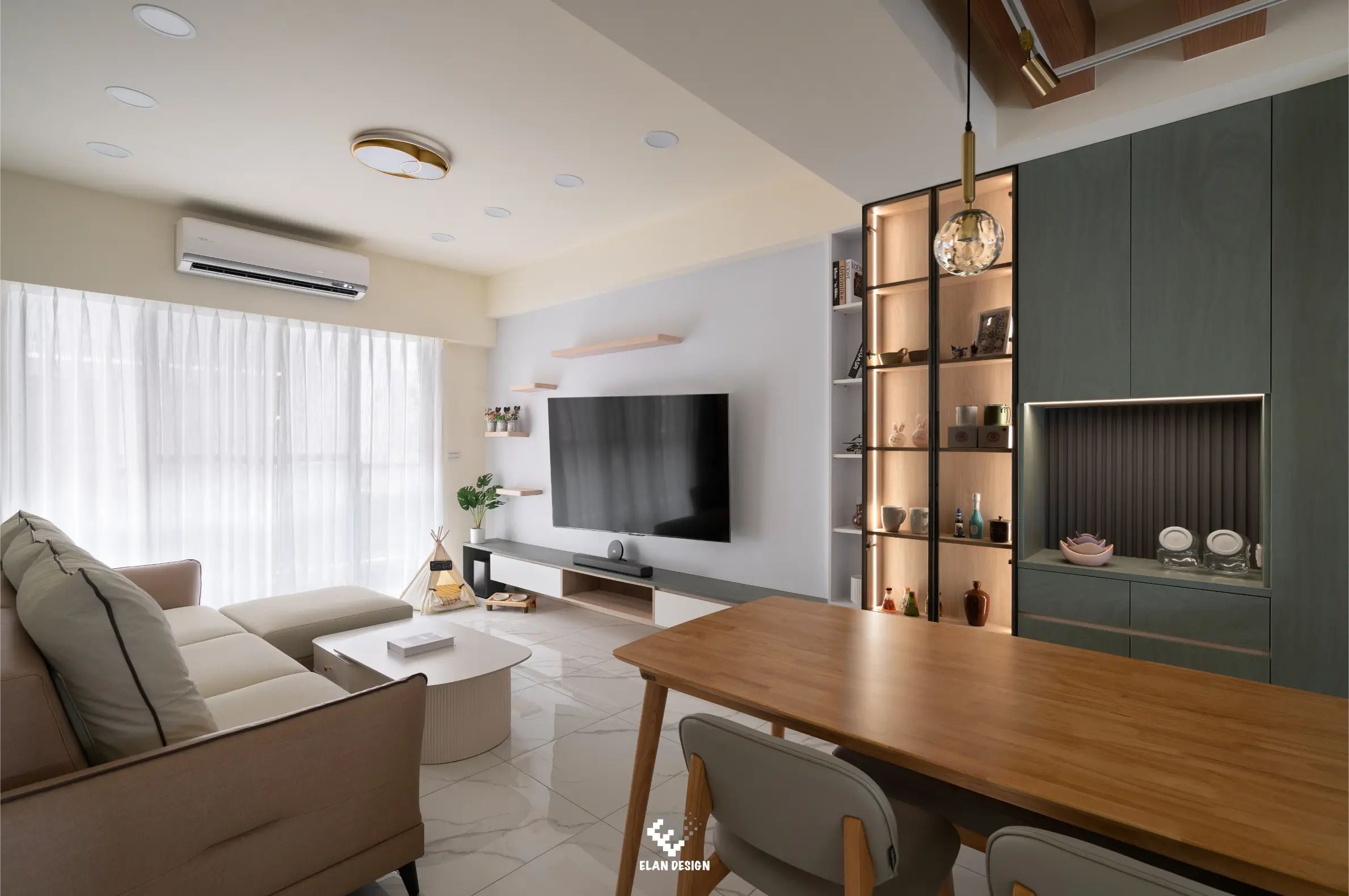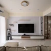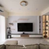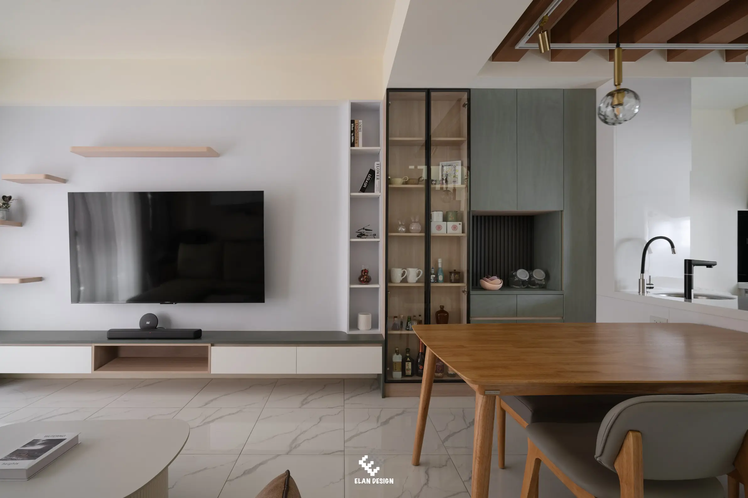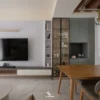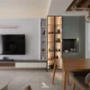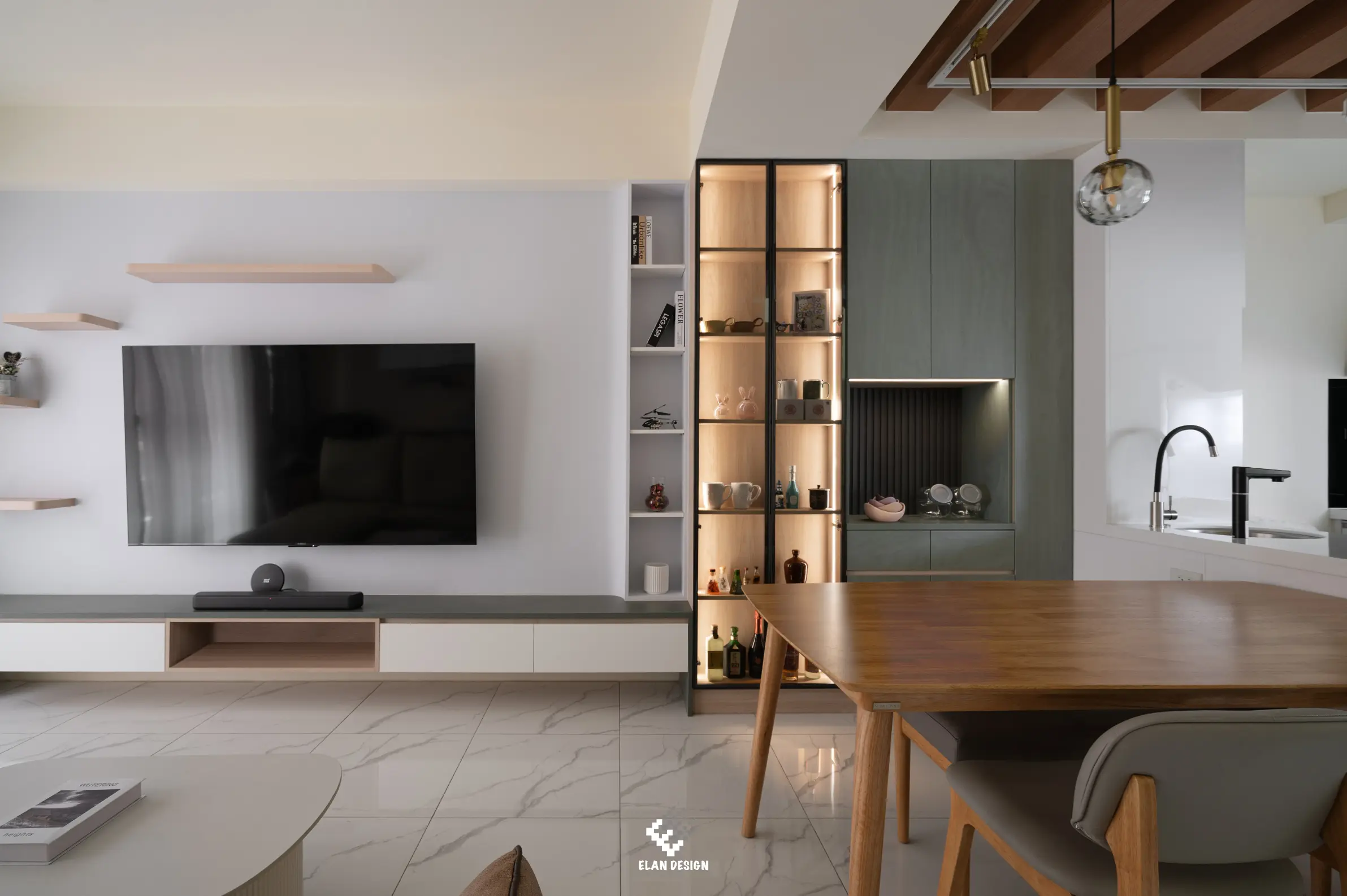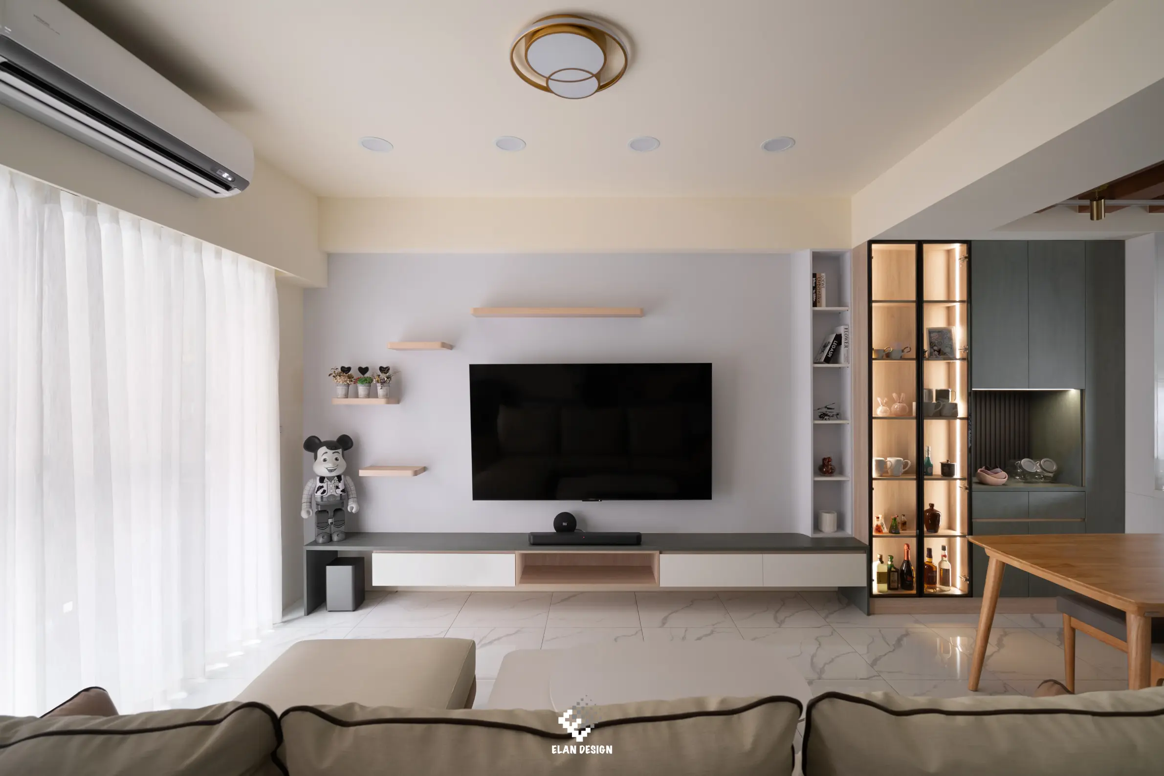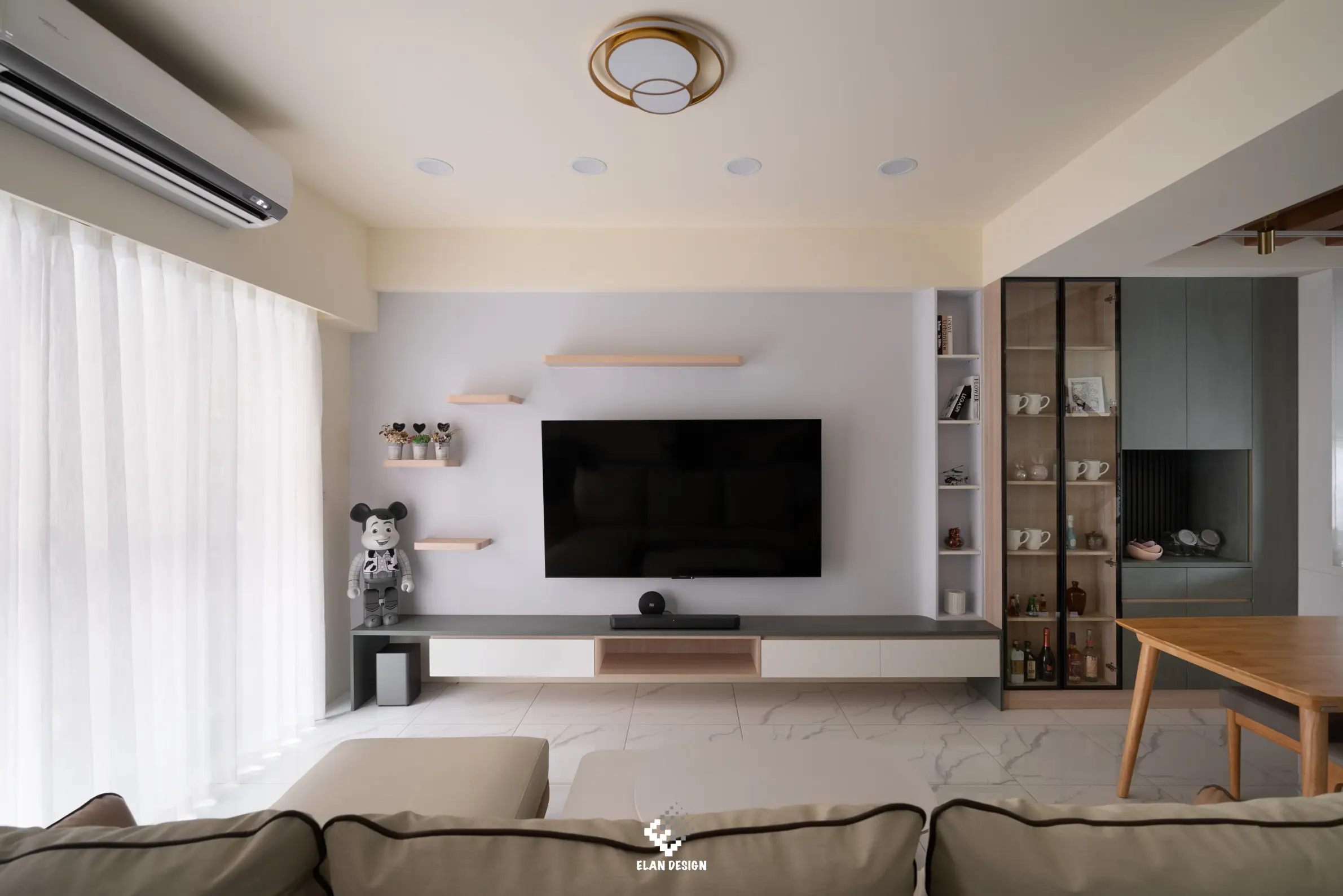 - 客廳牆面整合電視主牆、展示層板與玻璃櫃