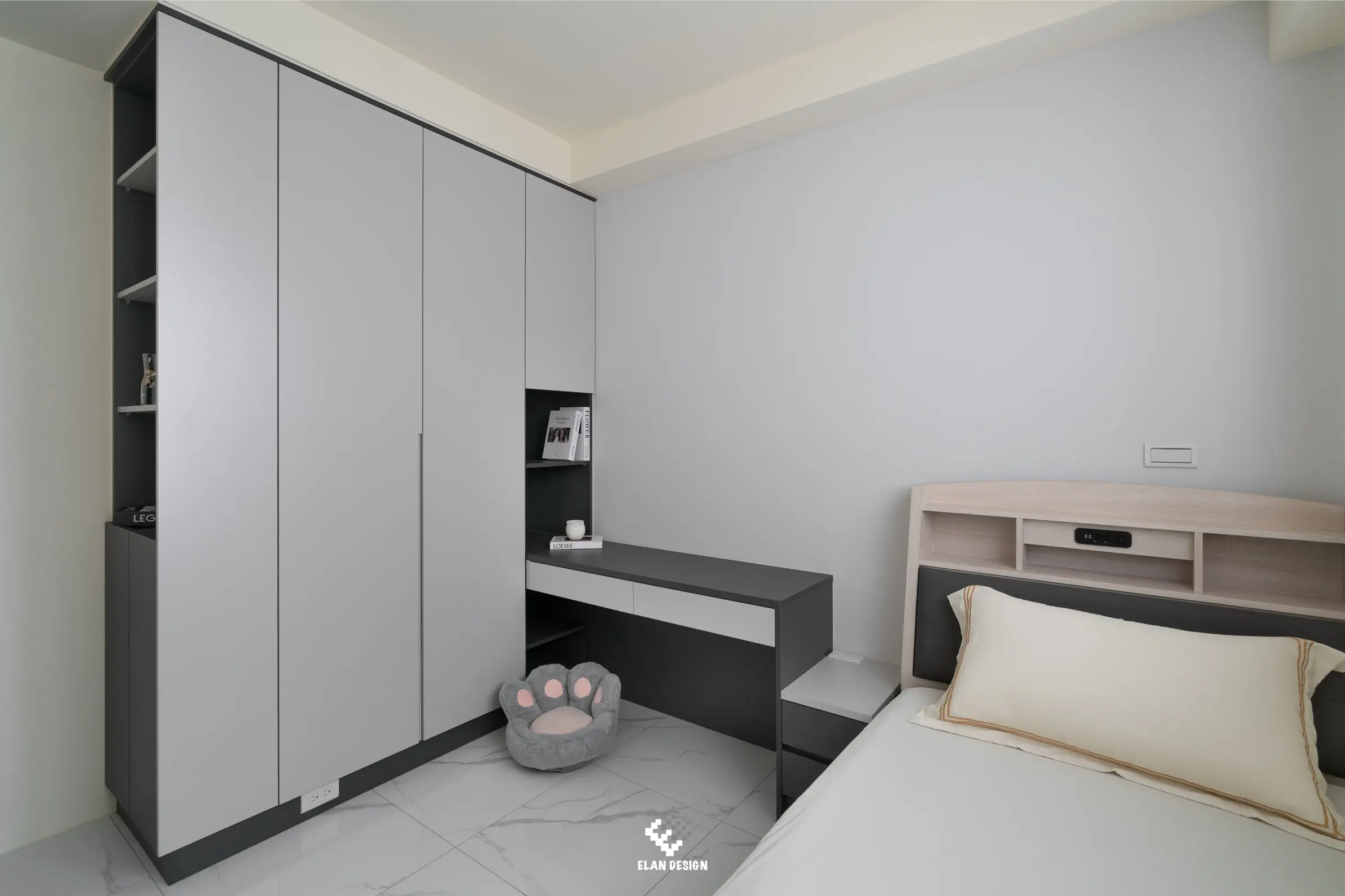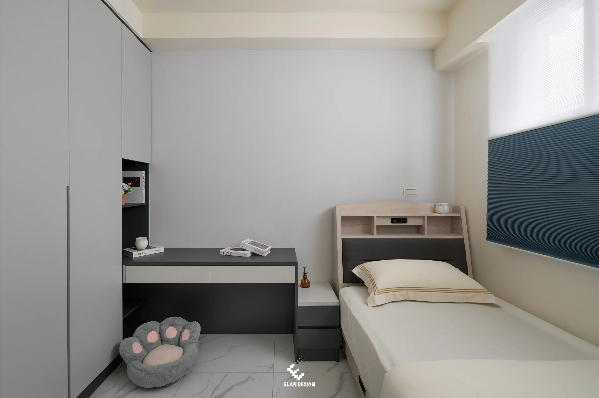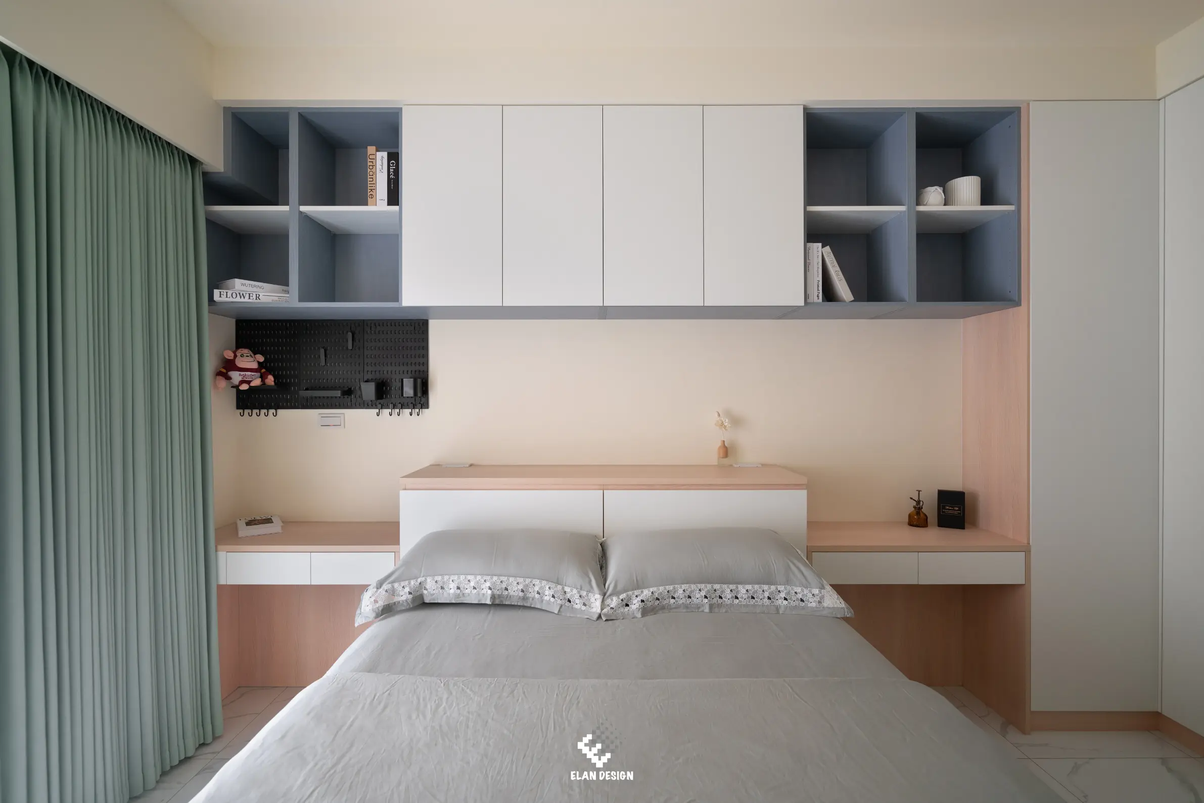 - 主臥搭配床頭上櫃、轉角書桌與大容量收納