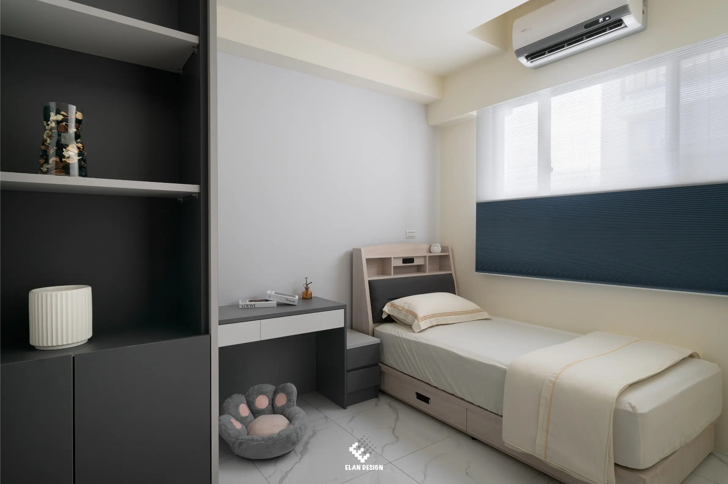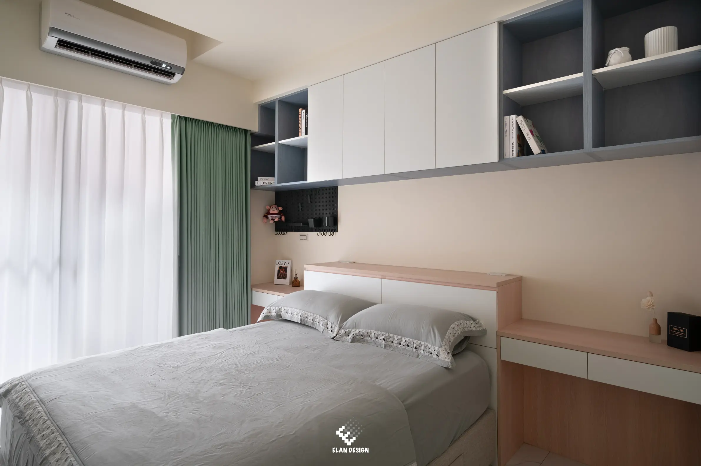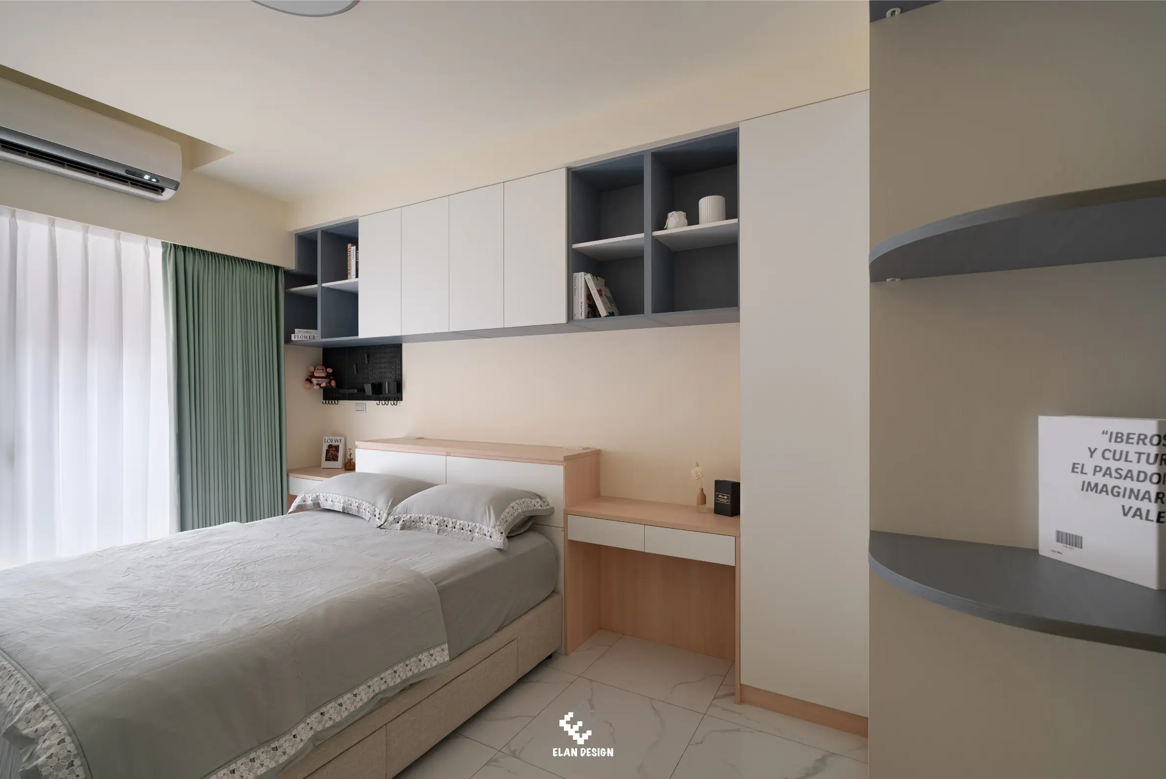 - 主臥搭配床頭上櫃、轉角書桌與大容量收納