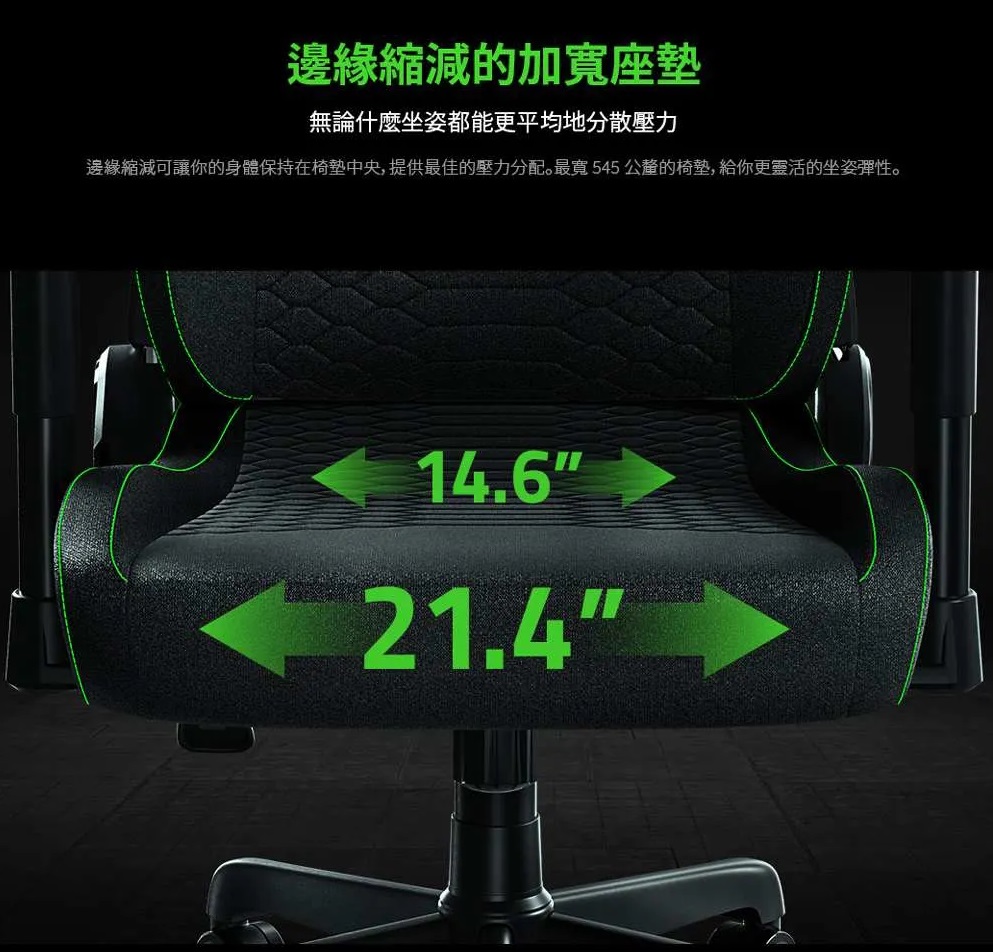 邊緣縮減可讓你的身體保持在椅墊中央,提供最佳的壓力分配。最寬 545 公釐的椅墊,給你更靈活的坐姿彈性。精心設計的高密度泡綿軟墊