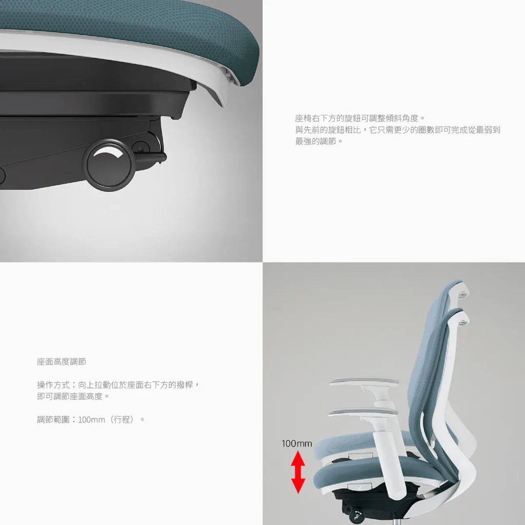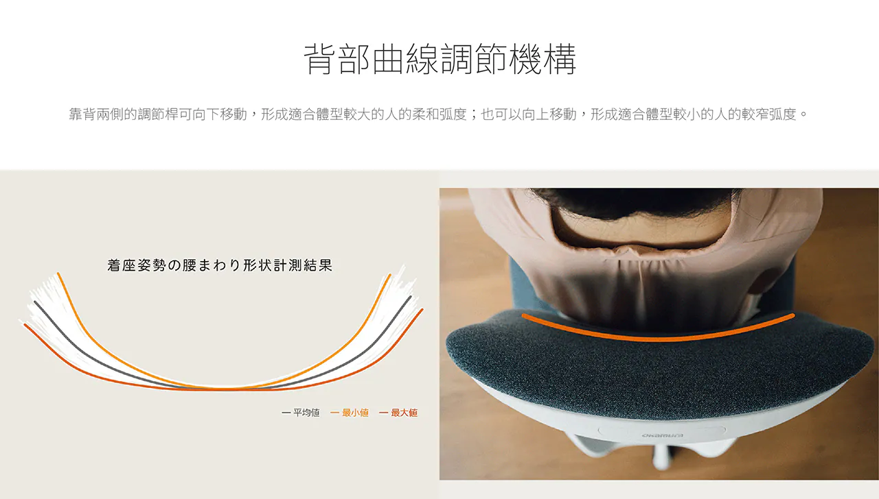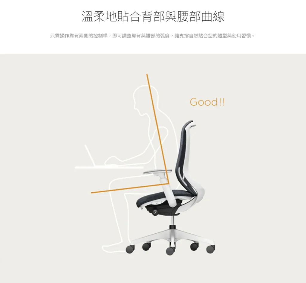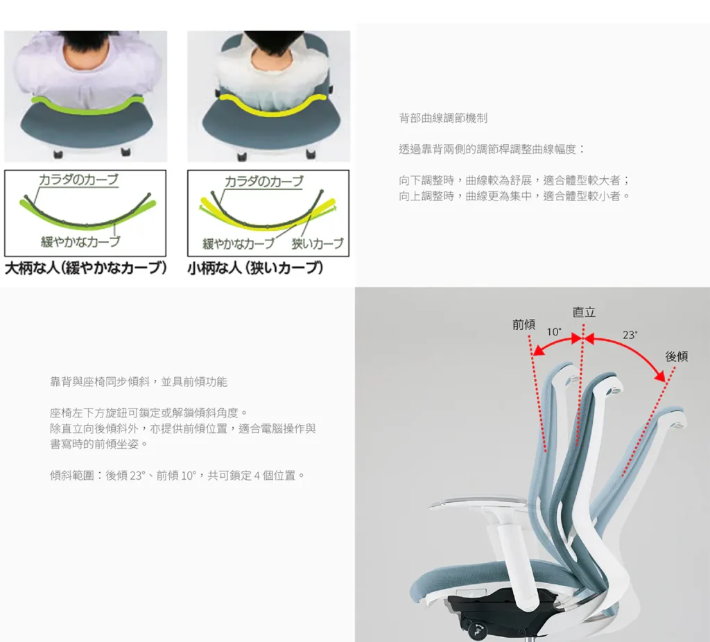 • 具前傾功能,背部包覆兩階段調整