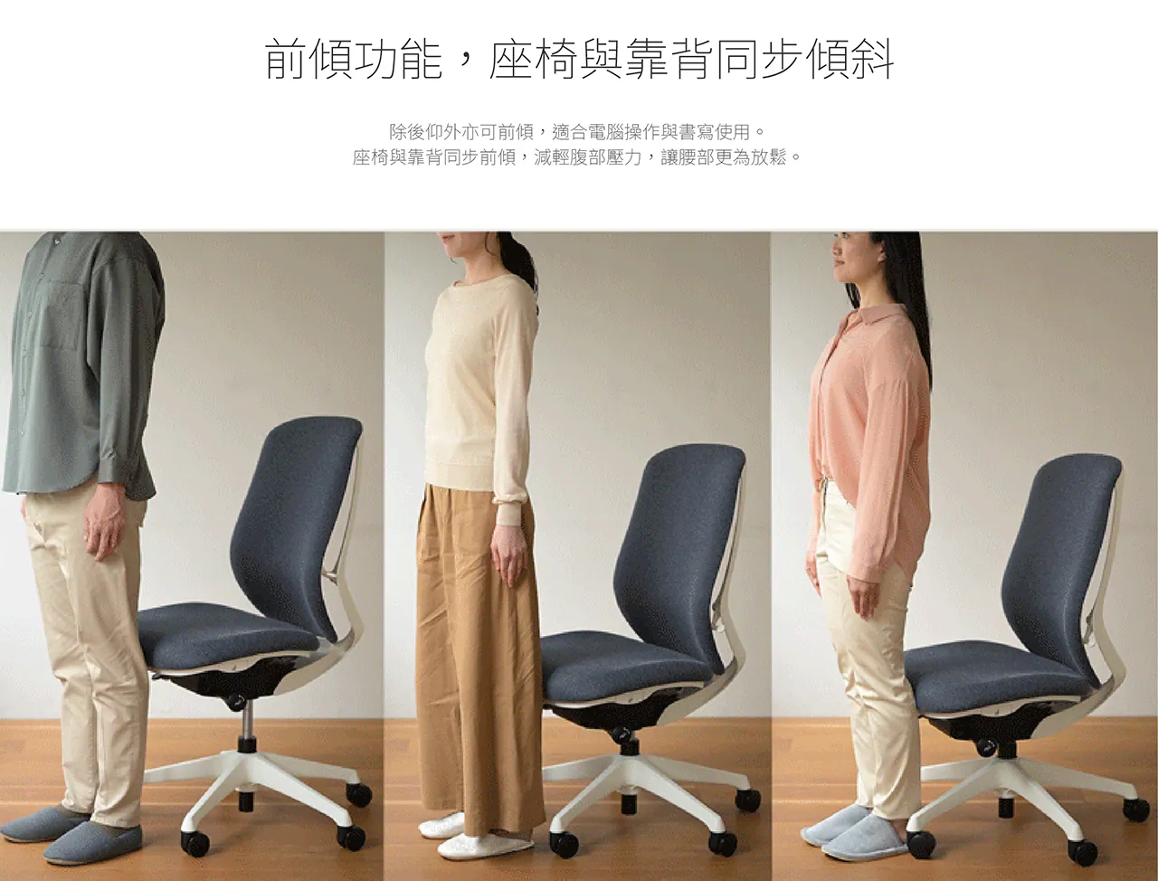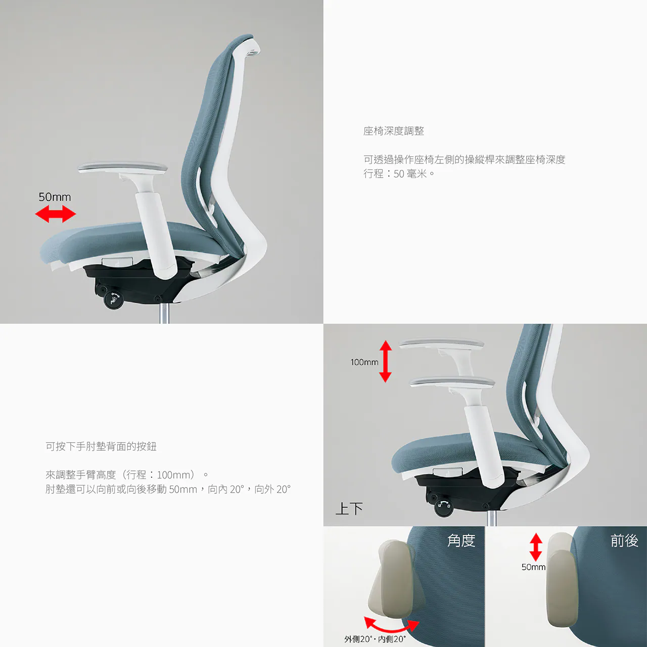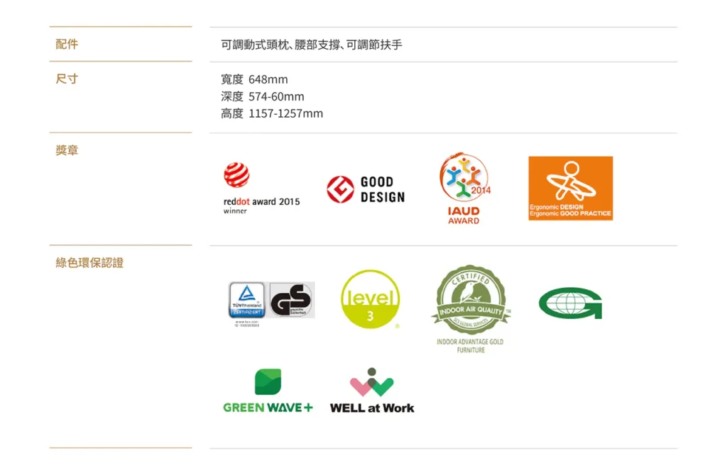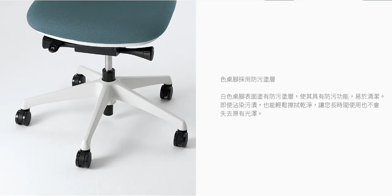 • 具前傾功能,背部包覆兩階段調整