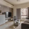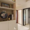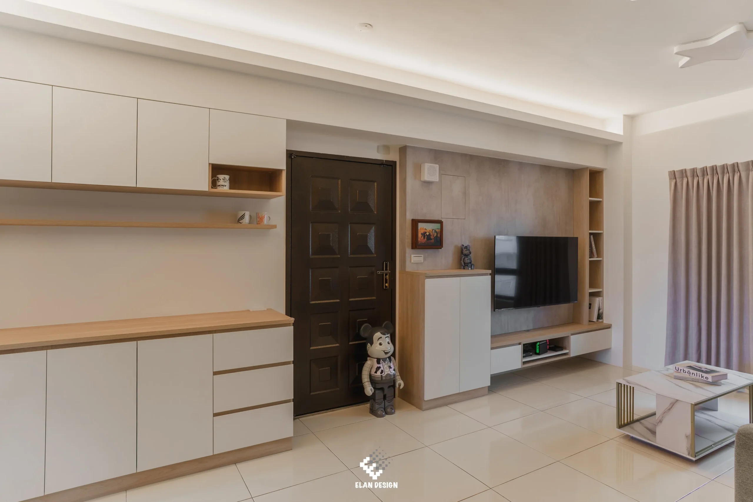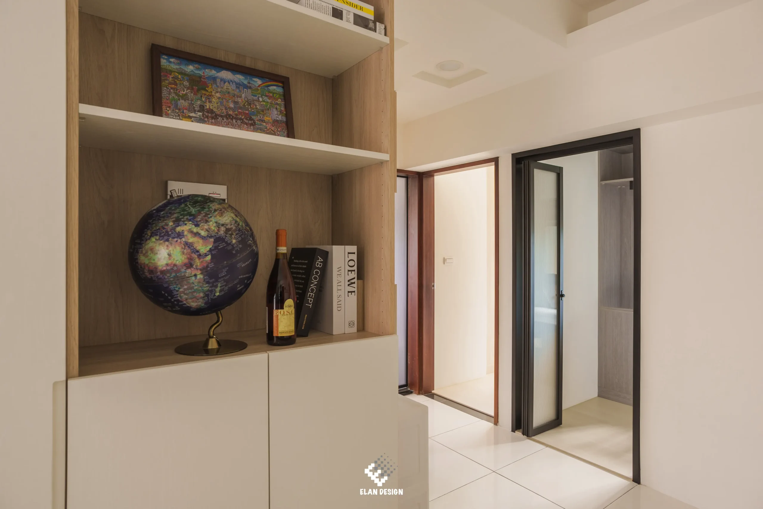 - 收納規劃|大量系統櫃設計,包含臥室衣櫃、玄關櫃、客廳展示櫃,讓生活用品井然有序。