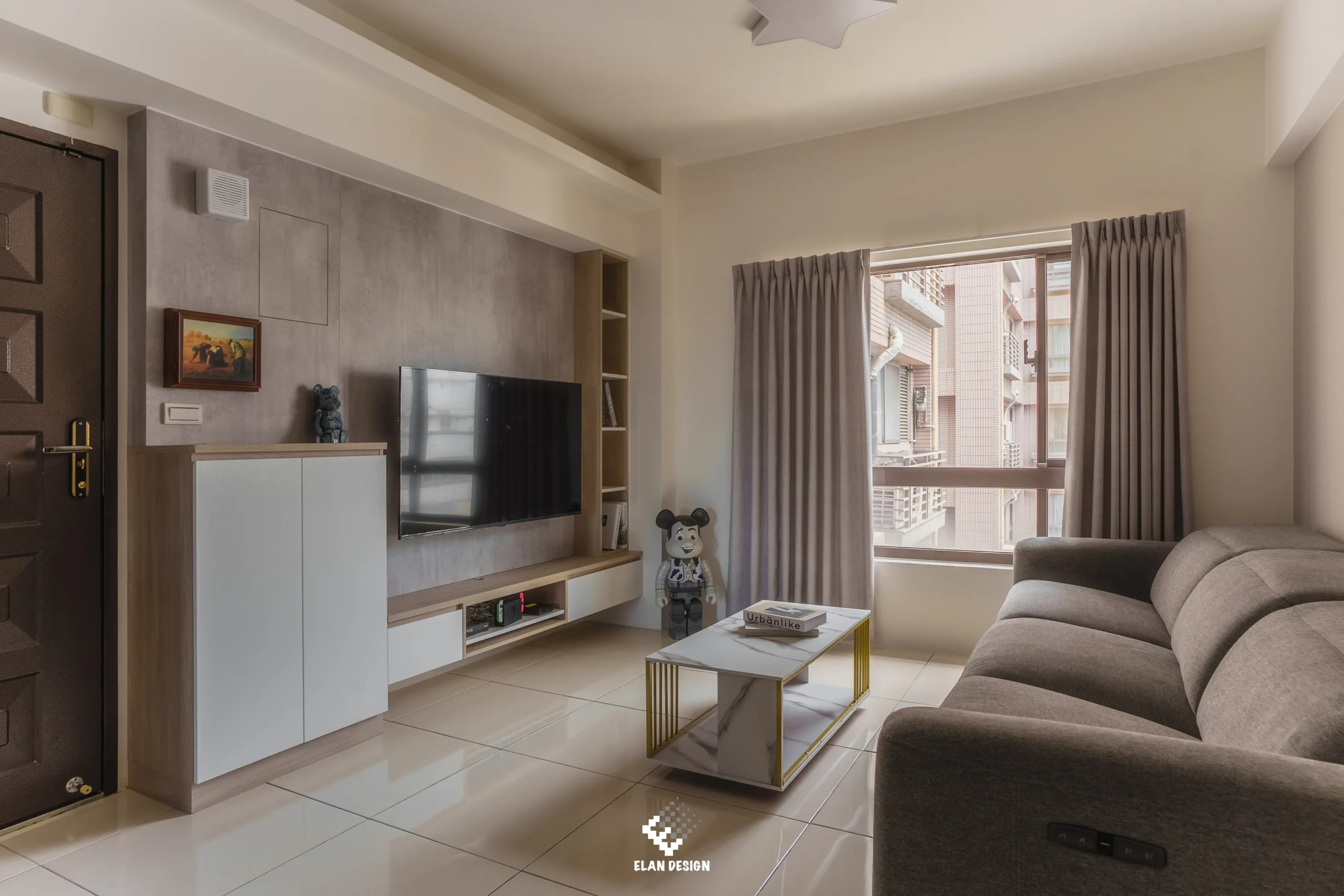 從玄關收納櫃、客廳電視主牆到臥室衣櫃,皆以白色與木質調融合,展現清新溫潤氛圍。