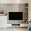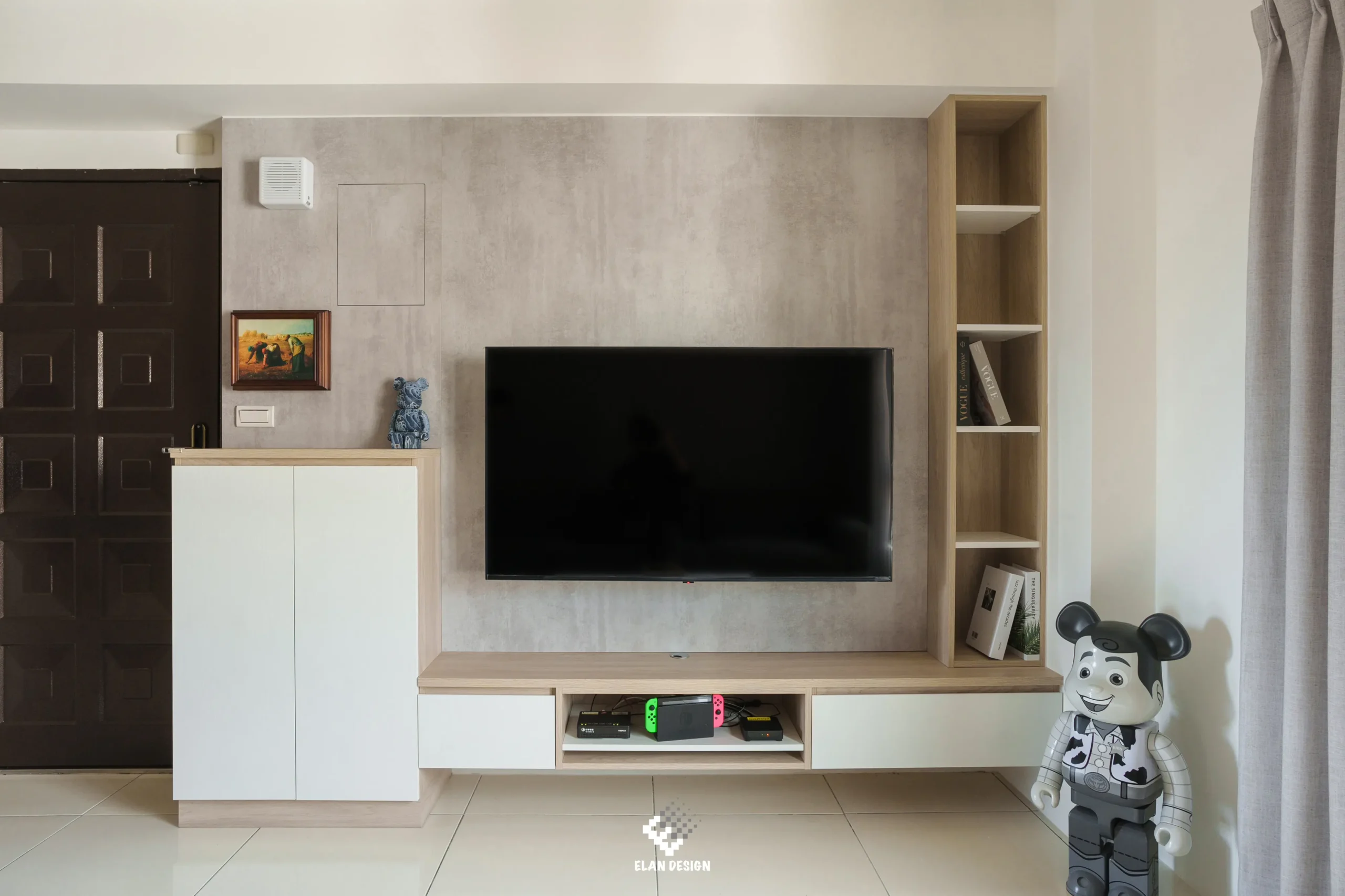 - 客廳設計|電視主牆以灰質感背板結合木質櫃體,搭配開放展示層板,增添立體感與實用性。